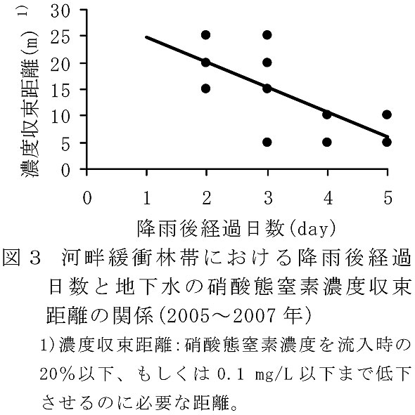 2)河畔緩衝林帯における地下水の硝酸態窒素濃度と塩化物イオン濃度の動態から、地下水中硝酸態窒素濃度の低下割合の内訳は、降雨直後では地下水による希釈が1/4で、残りが脱窒や植物吸収等の生物的除去によると推定される。降雨から5日後では、低下割合の大部分が生物的除去によると推定される(データ省略)。