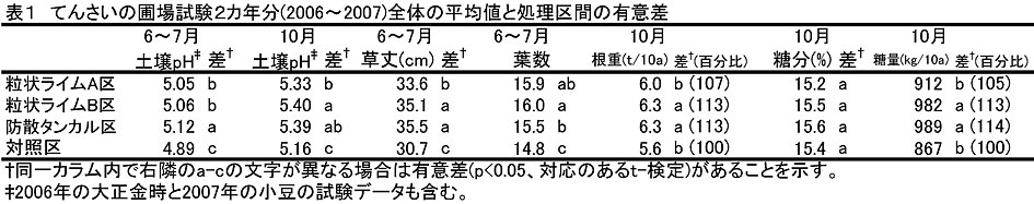 - 粒状ライムA(高炉セメントB種3%とタルク2%を添加し造粒)、B(酸化マグネシウム3%とタルク2%を添加し造粒)、及び防散炭カルを畑に施用し、てんさいを栽培すると、いずれの施用区においても対照区に比べて土壌pHが上昇し、草丈、葉数が増加する(表1)。