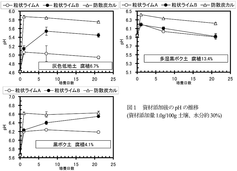 - 粒状ライムBは防散炭カルよりは土壌pHの上昇速度が遅く緩効的である(図1)。