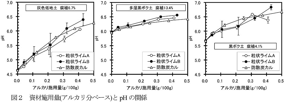 - 粒状ライムBの酸性矯正力は、アルカリ分ベースで防散炭カルと比較した場合には概ね同等である(図2)。
