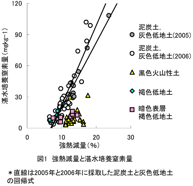- 土壌(泥炭土、灰色低地土、火山灰土、褐色低地土 10〜20g)を磁性るつぼに取り、電気炉で650℃、1時間半処理し、処理前後の重量を測定して重量の減少率を強熱減量(%)として求める。泥炭土や灰色低地土、褐色低地土については、強熱減量と土壌の湛水培養窒素量(30℃,28日間培養)との間には高い相関関係が示され、この関係は年次によって大きくは変わらない(図1)。