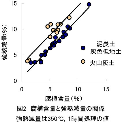 - 田畑輪換土壌の腐植含量と強熱減量とは相関関係を示し、火山灰土は同じ腐植含量でも泥炭土や灰色低地土よりも強熱減量が多い傾向にある(図2)。