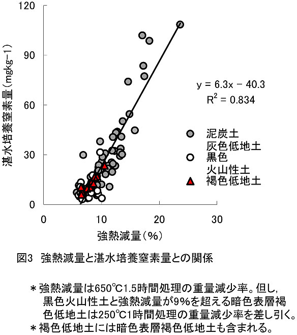 - 黒色火山性土や強熱減量が9%を超える暗色表層褐色低地土では強熱減量と湛水培養窒素量との関係が認められないが(図1)、650℃における強熱減量から250℃、1時間処理による重量減少率を差し引く補正を行うことで、同じ直線上で強熱減量から湛水培養窒素量を評価することが可能である(図3)。