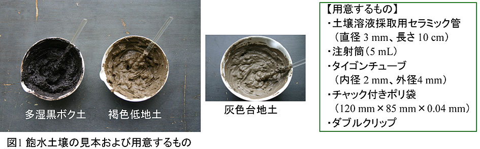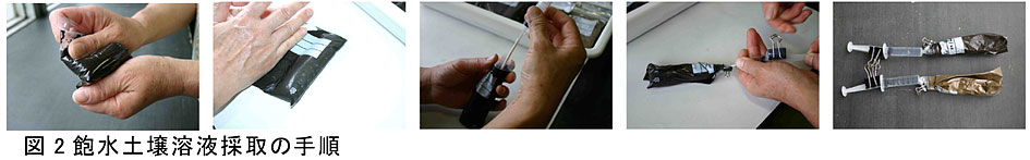 - ポリ袋に生土約70 gを取り飽水状態まで水を加えて捏ねた後、セラミック管と注射筒を用いて土壌溶液を吸引、採取する(図2)。これは供試土壌の水分測定を必要とせず、また、秤やシリンダーなどの器具を用いない現場対応型の試料採取法である。