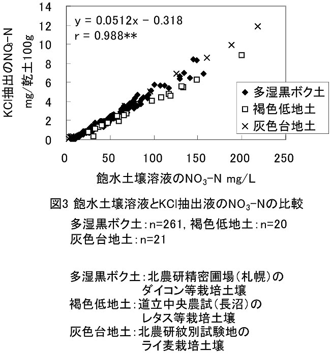 - 以上より、飽水土壌溶液の採取により、供試土壌の水分を考慮することなく現場で簡易に土壌NO3-N濃度の測定が可能であり、y = 0.0512 x − 0.318(y:KCl抽出のNO3-N、x:飽水土壌溶液のNO3-N)により乾土100g当りmgに変換できる。