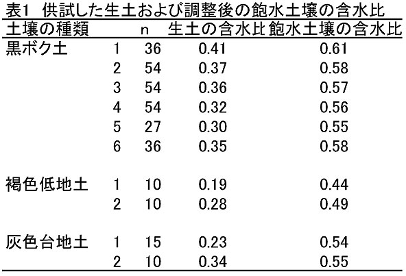 - 供試した生土の含水比は0.19〜0.41であり、調整後の飽水土壌の含水比は0.44〜0.61である(表1)。
