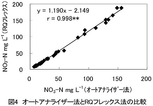 - 飽水土壌溶液のNO3-N濃度は、KCl抽出による土壌NO3-N濃度との間に、作物の生育期間に係わらず高い相関関係があり、それは褐色低地土でやや異なるものの多湿黒ボク土、灰色台地土で同じである(図3)。また、測定に簡易法であるRQフレックス法が利用できる(図4)。