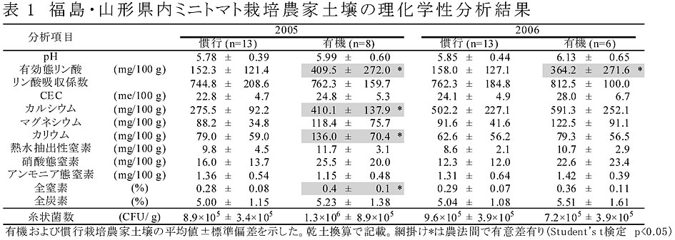 - 調査対象は福島県、山形県内のミニトマト栽培中のハウス内土壌(2005年:有機8カ所、慣行13カ所、2006年:有機6カ所、慣行13カ所)であり、有機はJAS有機認証農家、および慣行は化学肥料、農薬を施用し、堆肥等の有機物も施用している農家である。