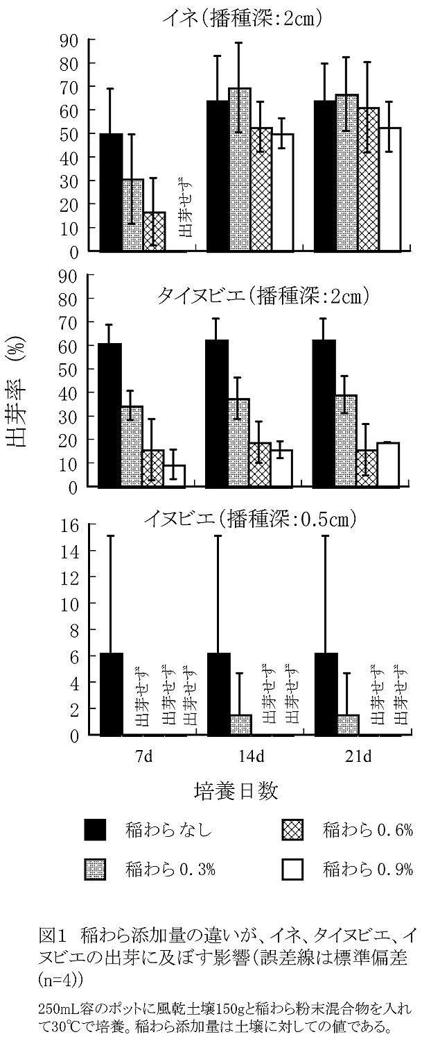 - 水田土壌(風乾土)と稲わら粉末の混合物を湛水し、イネ(ほしのゆめ)、タイヌビエ、またはイヌビエを深さ2pで播種して培養すると、イネ及びタイヌビエは、培養7日目には、稲わら添加量が多くなるに従って、出芽が抑制される(図1)。その後、イネの出芽率は、回復するが、タイヌビエの出芽率はほとんど変化しない。