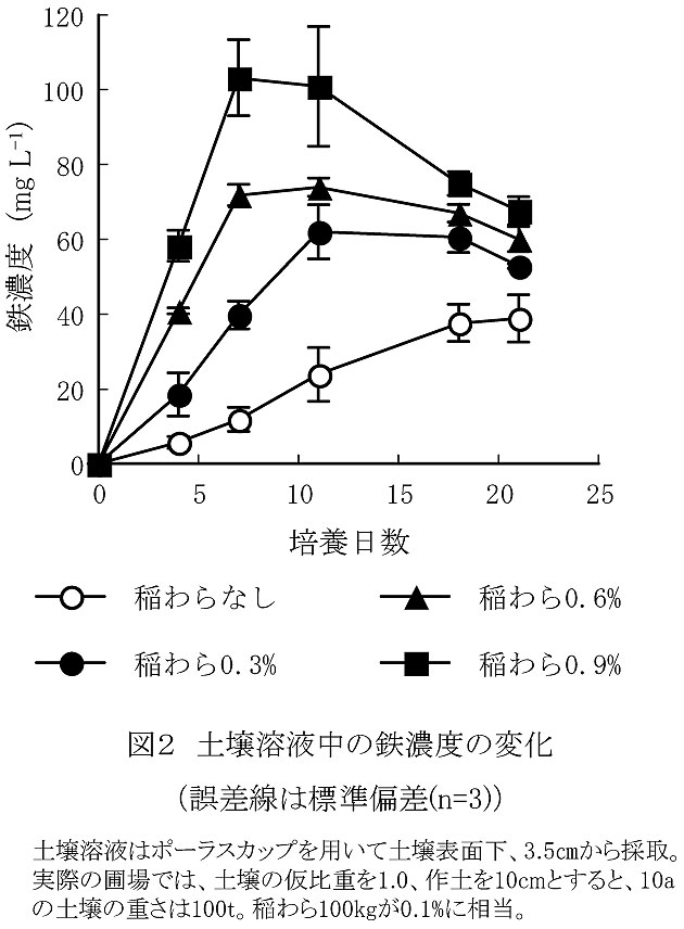 - 土壌溶液中の二価鉄は、稲わら添加量とともに増加し、その量は稲わら0.9%添加区で、最大、100 mg L-1 程度となる(図2)。