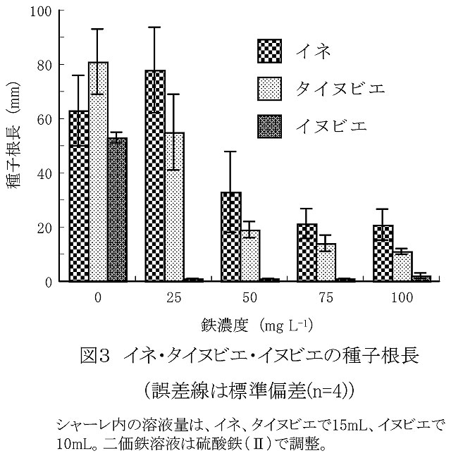 - シャーレに、イネ、タイヌビエ、イヌビエのいずれかの種を入れた後、0、25、50、75、100 mg L-1の二価鉄溶液とともに7日間培養すると、二価鉄量の増加に伴って、イネ、タイヌビエ、イヌビエ種子根の伸長が抑制され、その程度は、イヌビエ>タイヌビエ>イネとなる(図3)。ただし、発芽率はイネでは100%、タイヌビエは約60%、イヌビエは約30%で、鉄濃度の違いによる有意な差はない(データ非表示)。