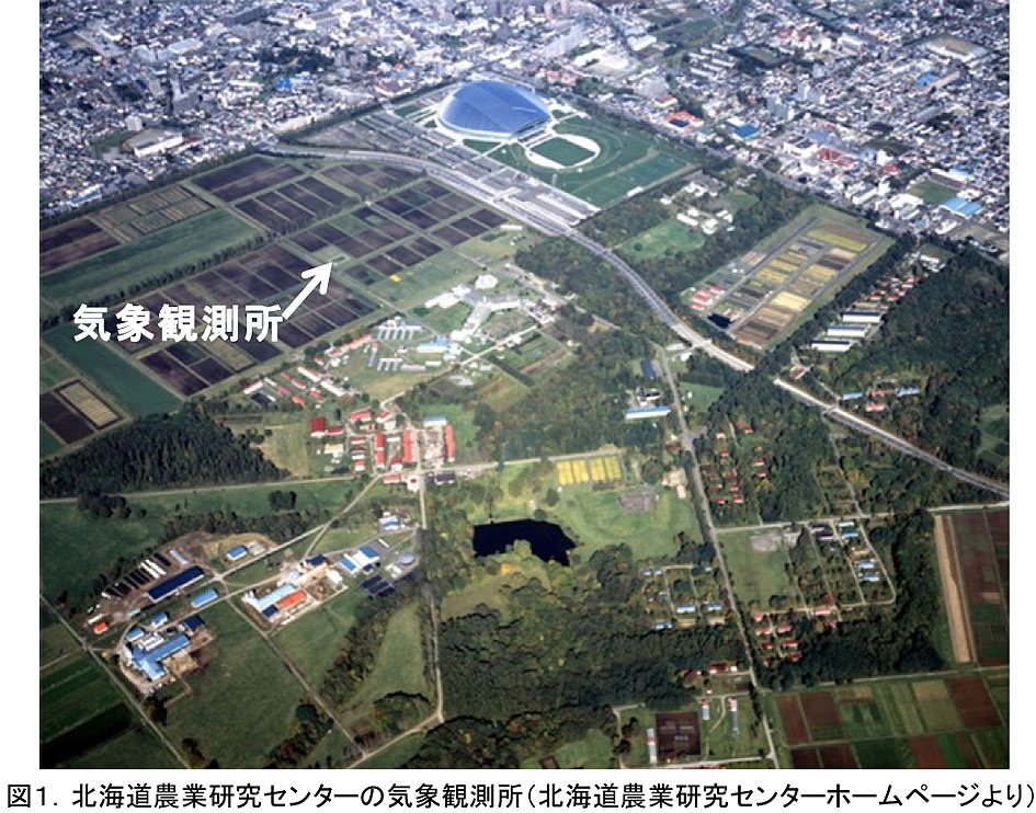 北海道農研は札幌市内に位置するが、広大な緑地から成り、都市化影響が僅少な環境である。北海道農研で観測された過去40年間の気温の長期上昇程度は、日本の気温上昇の評価に使用される寿都などの気象観測所における値より低い。