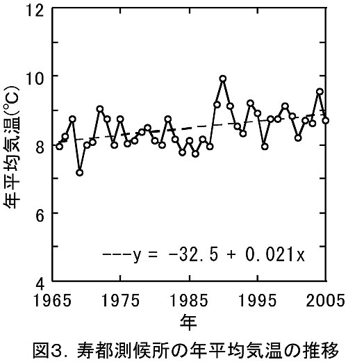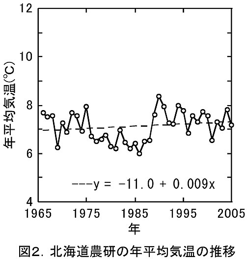 - わが国では、寿都など、都市化などによる環境の変化が比較的少ない地点(気象庁)の気象観測データが、温暖化による気温の長期上昇程度を把握するために使用されている。しかし、北海道農研における気温上昇程度は、これら観測所における40年間の気温上昇程度(寿都では0.021℃/年である:図3)よりも低く、都市化の影響がきわめて小さいと考えられる。
