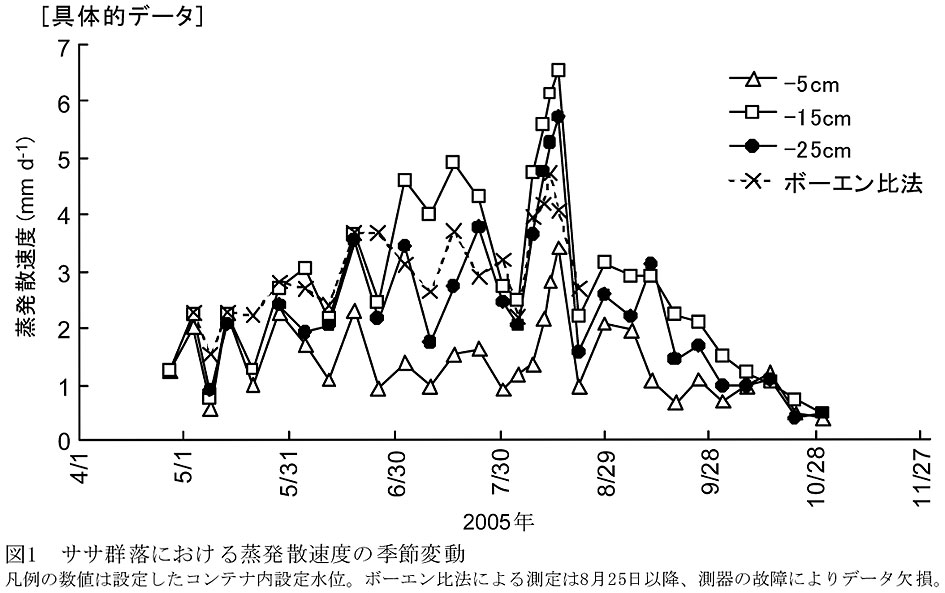美唄湿原ミズゴケ群落はササ群落に比べ蒸発散量が多く、前者では降雨の約80%、後者では約70%が蒸発散で消費される。蒸発散推定手法としてのライシメータ法は、設定水位が現地の地下水位環境を反映する場合、ササ群落でも利用可能である。