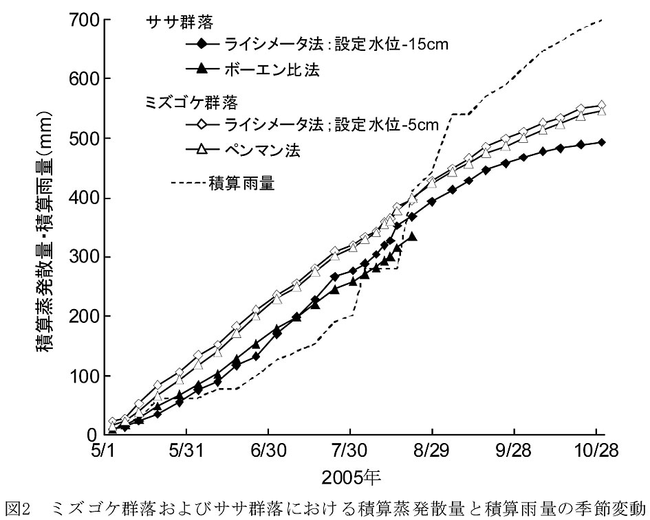 - 2006年5月6日〜2006年11月1日の積算雨量は700mmあり、ササ群落では約70%、ミズゴケ群落では約80%が蒸発散により消費される(図2)。