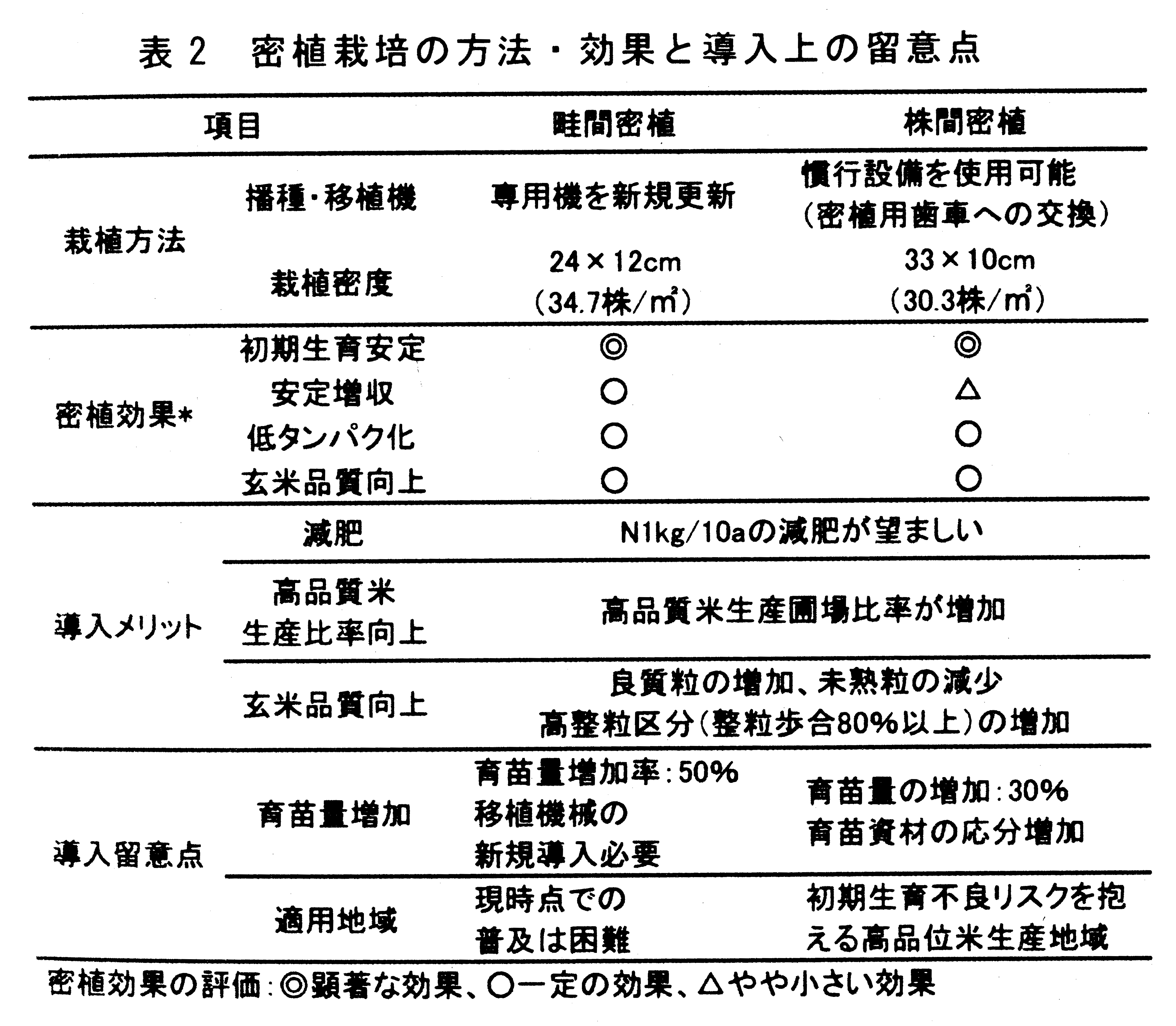 水稲の成苗・密植栽培は、減肥条件でも、減収を伴わず産米の高品位化(低タンパク・高整粒化)が可能であり、高品位米出荷率の向上や減肥の推進などを通じて、生産地域のブランド力向上に貢献する技術であると評価できる。畦間密植の効果は高いが、専用機を要し、育苗資材と労力の50%増を考慮すれば普及性はきわめて低く、現行機械を用いる株間密植の実用性が高い
