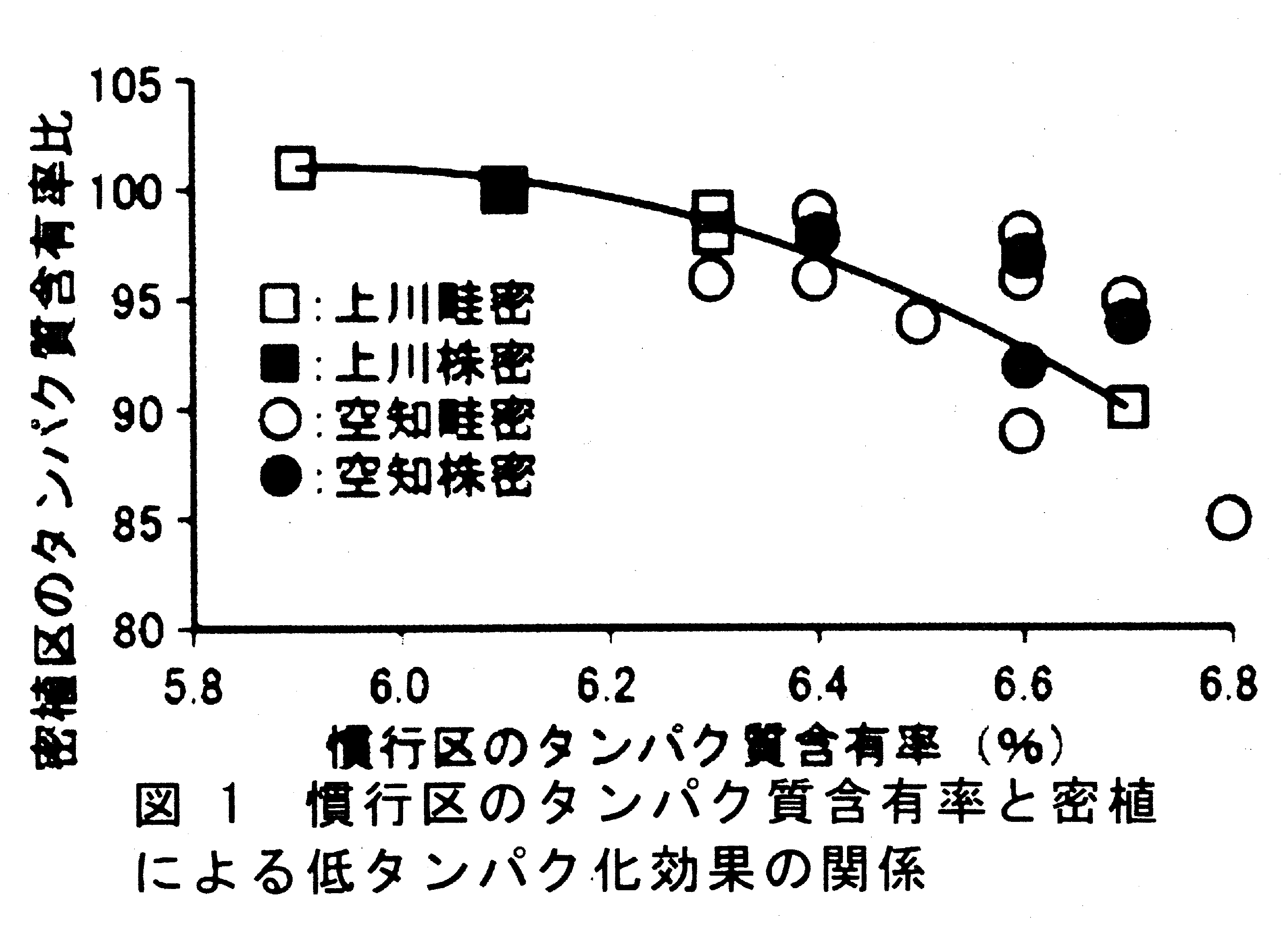- 密植による低タンパク化効果の発現程度には圃場間差が認められ、土壌・気象的に初期生育が不良で、慣行栽培でのタンパク質含有率が高い圃場ほど改善効果が大きく、逆に慣行栽培でのタンパク質含有率が低い圃場では効果が小さい(図1)。