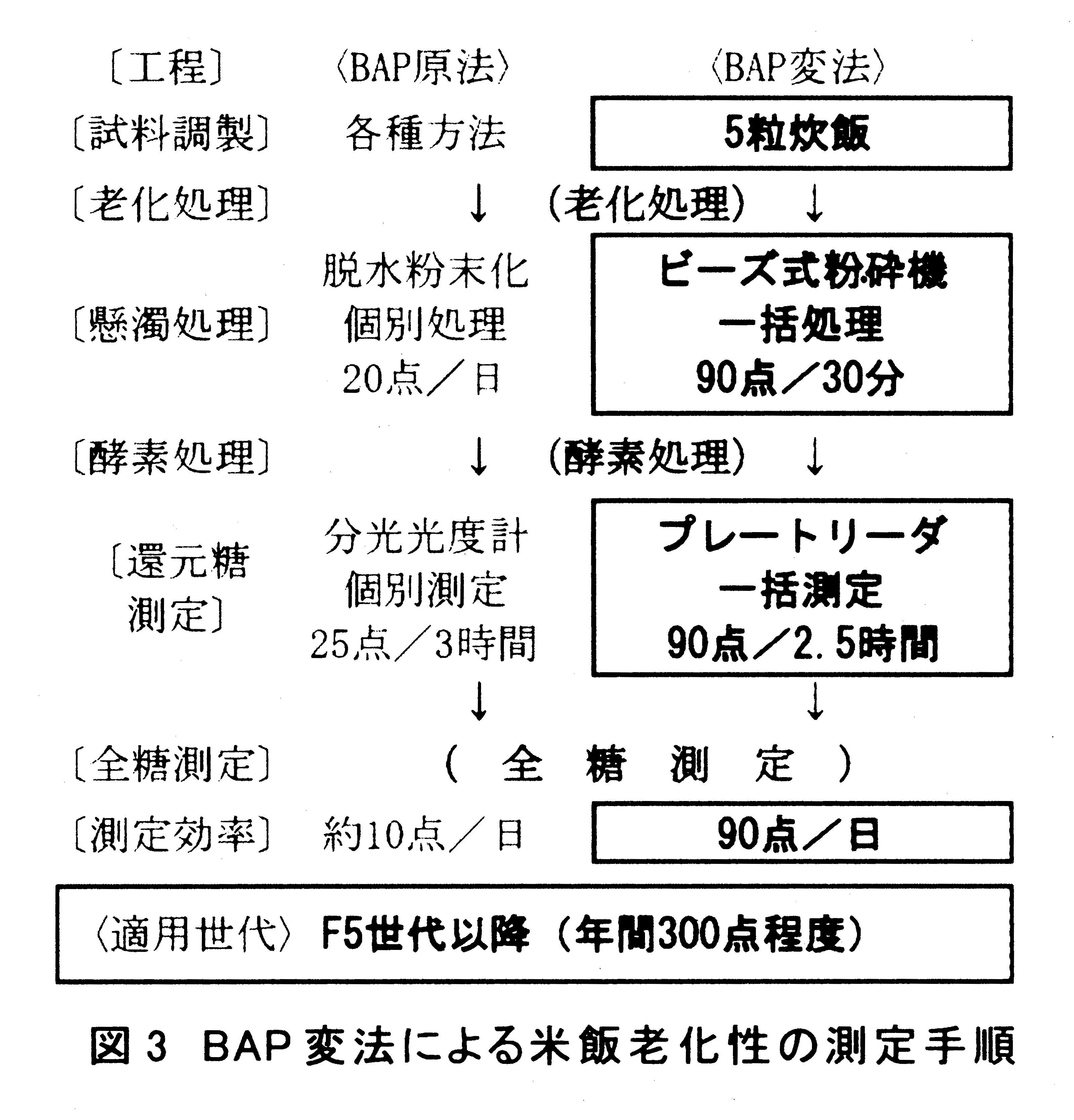 高品位米の選抜を強化するための食味検定法として、多点数一括処理が可能なBAP(βアミラーゼ-プルラナーゼ法)前処理方法およびプレートリーダーを活用した還元糖測定法を考案し、これらを組み入れた測定手順により、90点/日の測定が可能になる(図3)。米飯の食味劣化程度の指標となる老化性を用いて育種材料の選抜や、実需評価における老化進行程度のモニタリング、最適炊飯・保温条件の解析にも用いることができる。