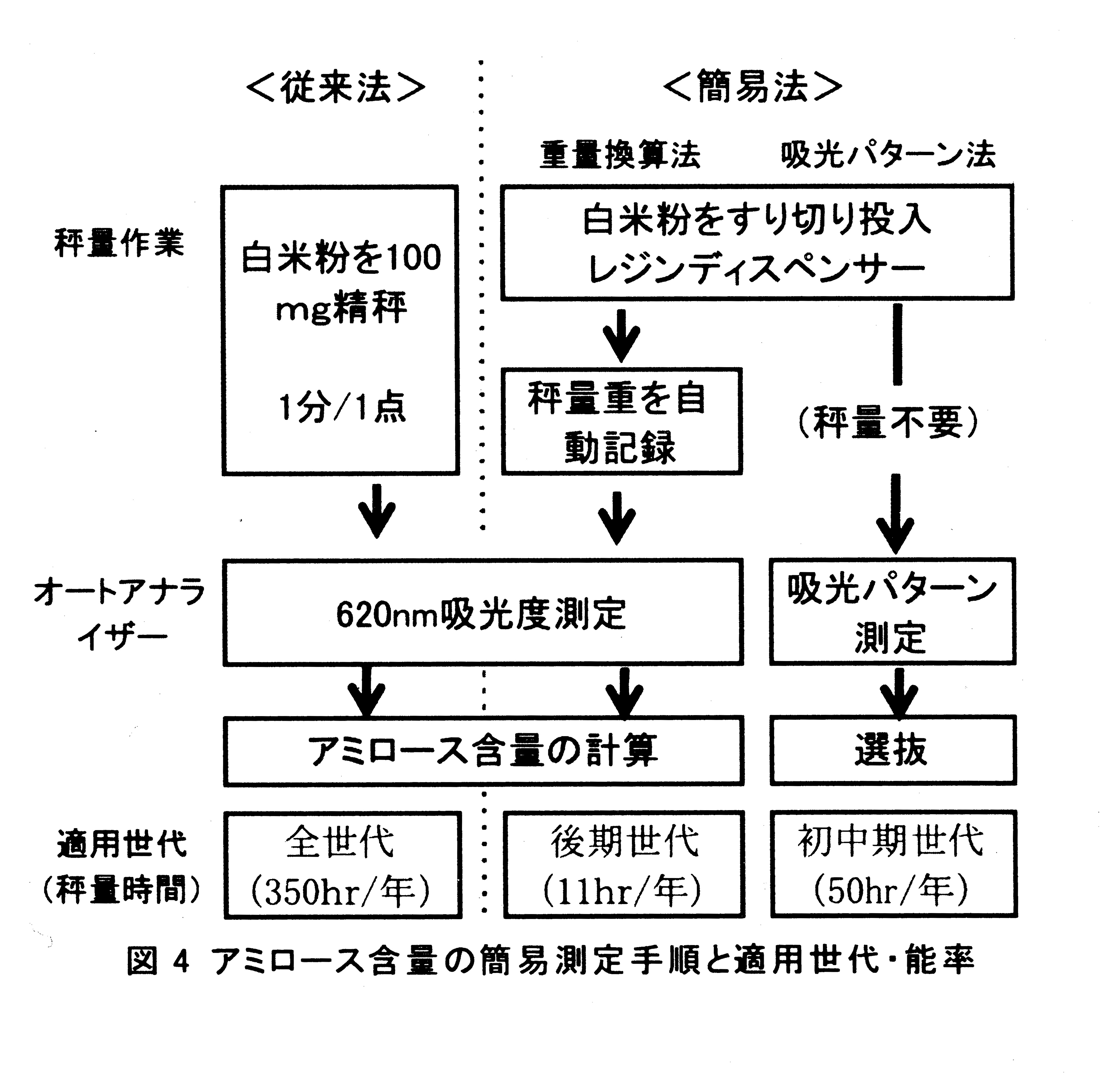 レジンディスペンサーによる簡易秤量、重量補正法を導入することにより、従来法によるアミロース含量の測定を簡易化できる。また、マルチチャンネルディテクタを備えたオートアナライザーを用いて、秤量を省略し、吸光パターンからアミロース含量を推定する手法を開発した。これらの簡易測定法の導入により、試料の秤量時間を従来法の1/3〜1/6に短縮でき、育種材料の選抜を効率化できる(図4)。