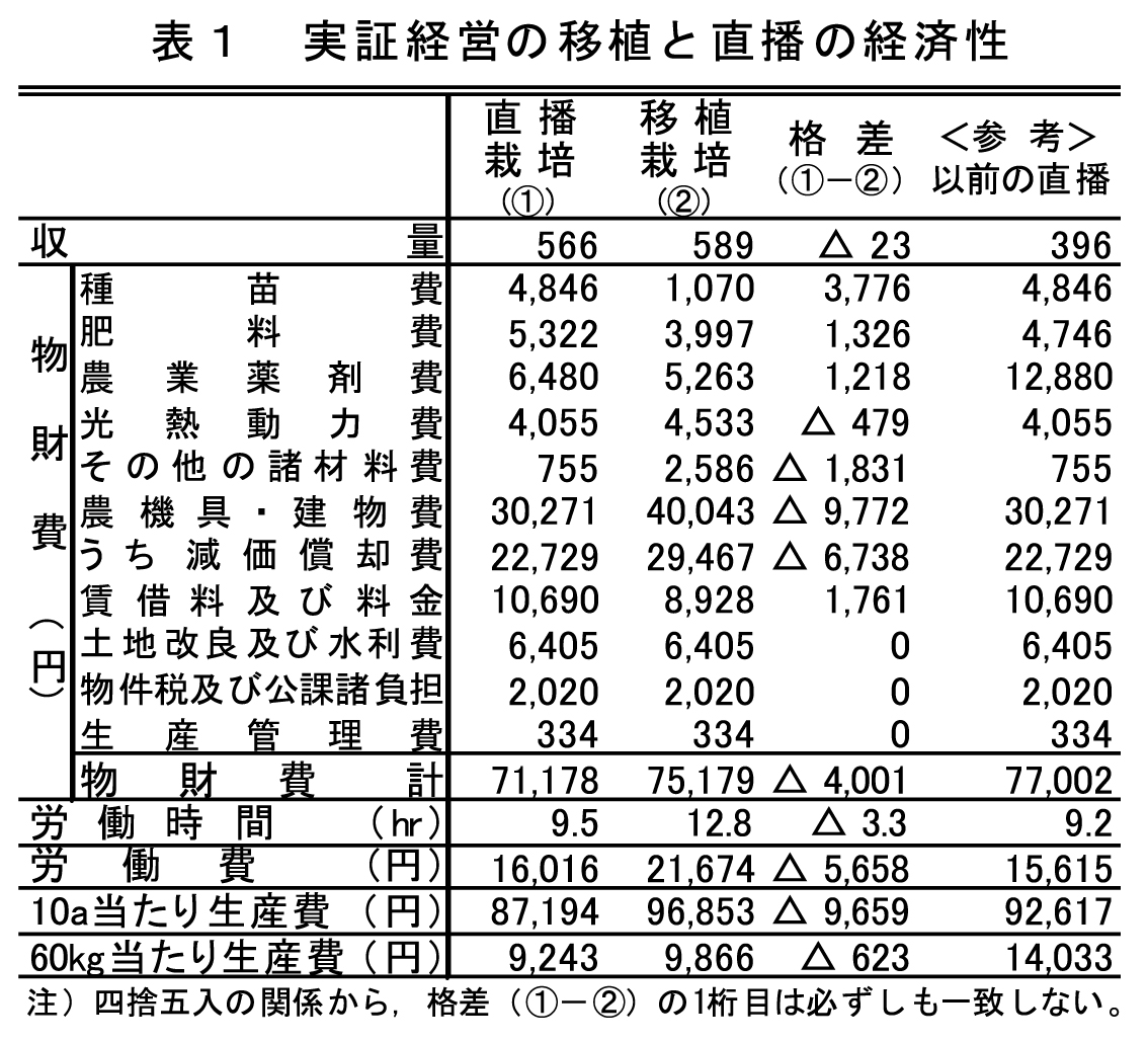 実証経営における直播栽培は,移植栽培に比して、物財費で4,000円/10a、総費用で9,700円/10a低い(表1)。直播栽培の低コスト化は播種機の共同利用と技術習得を前提とし、これには20ha程度の播種機稼働面積の確保を目指す必要がある。