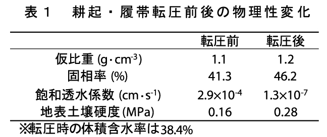 耕起・履帯転圧することで土壌硬度が増すとともに、透水性が低下して(表1)下方浸透が抑制される。