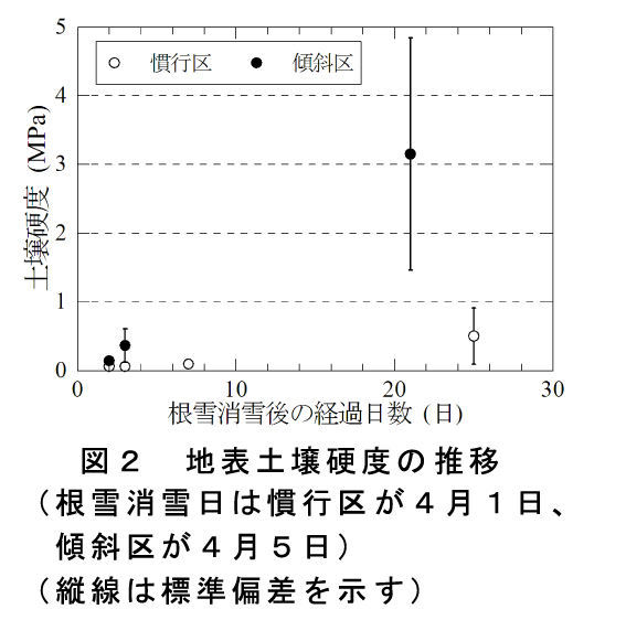 根雪消雪後の地表面下15cmまでの地耐力は、根雪消雪2日後では傾斜区で0.64MPa、慣行区で0.45MPa、4月25日では傾斜区で2.18MPa、慣行区で0.90MPaであり、傾斜区は慣行区に比べて地耐力が高く、根雪消雪後の地表面土壌硬度の上昇が早いことから(図2)、機械作業の開始時期を早めることができる。