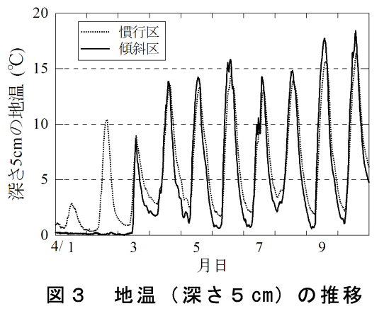 根雪消雪後の深さ5cmの地温は日中で、傾斜区が慣行区より2〜4℃高く(図3)、蒸発が促進される。