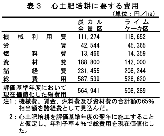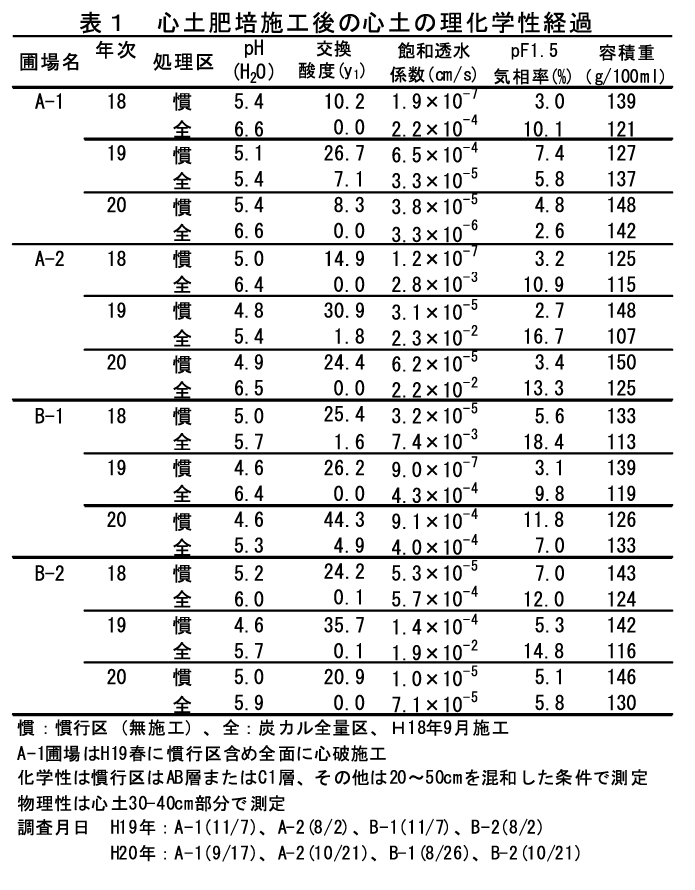 心土20〜50cm深(30cm厚)中に、炭カル、ライムケ−キ(粒状)を投入する心土肥培耕プラウの施工により、心土の粗孔隙、透水係数等物理性が改善されるとともに、酸度矯正が矯正される。ただし、施工3年目では物理性の改善効果が低下すると見られる場合がある(表1)。