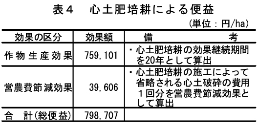 心土肥培耕の施工に要する総費用は、炭カル全量区で564,941円/ha、ライムケーキ区で508,289円/haとなる(表3)。一方、心土肥培耕による年効果額(増加純収益)に基づき作物生産効果を求め、これに営農費節減効果を加えると、総便益は798,707円/haとなる(表4)。以上の結果から総費用総便益比を求めると(@式参照)、炭カル全量区で1.41、ライムケーキ区で1.57となり、本試験で実証した心土肥培耕は十分な経済効果を発揮すると判断できる。