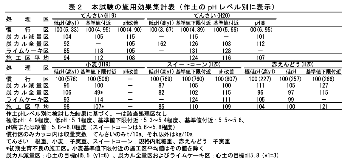 作土pHが低い場合には効果が認められないことが多く、安定した効果を得るには、作土pH5.3以上(y1=9以下)が必要である。当該pH以上の増収効果程度の平均は施工後2ヵ年で13%程度であり、心土の改良目標としてはpH5.8(y1=3)が適当である。