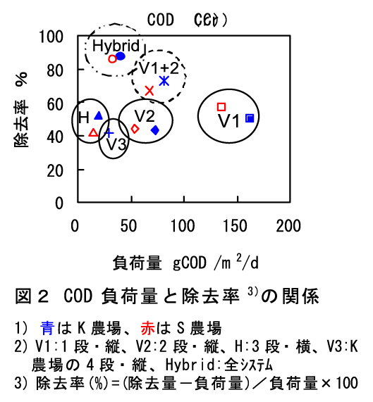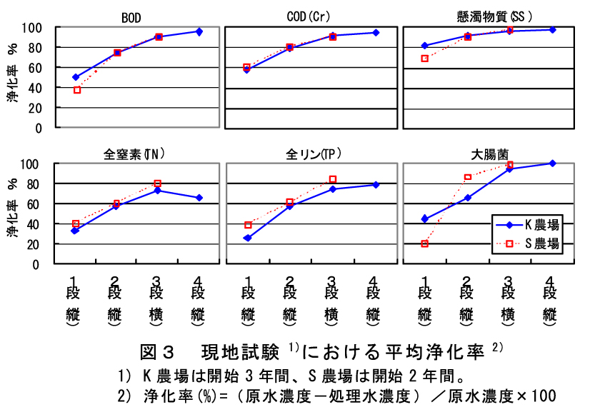 有機物(BOD、COD)やSS、大腸菌の浄化率は9割以上で、全窒素や全リンの浄化率は6〜8割である(図3)。この効果は冬季も含めて通年で発揮される。