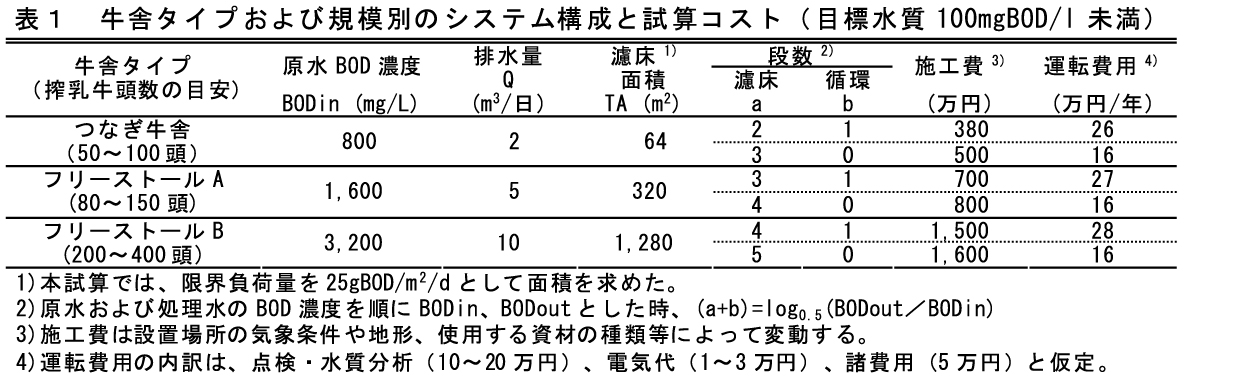 上記の結果から処理水を目標濃度(BOD=100mg/l)未満とする伏流式人工湿地システムについて、牛舎のタイプや規模別の構成とコストの試算例を示す(表1)。
