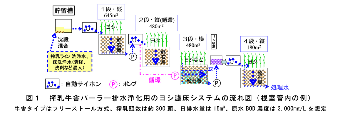 伏流式人工湿地、ヨシ濾床、畜産排水、搾乳牛舎パーラー排水、水質浄化