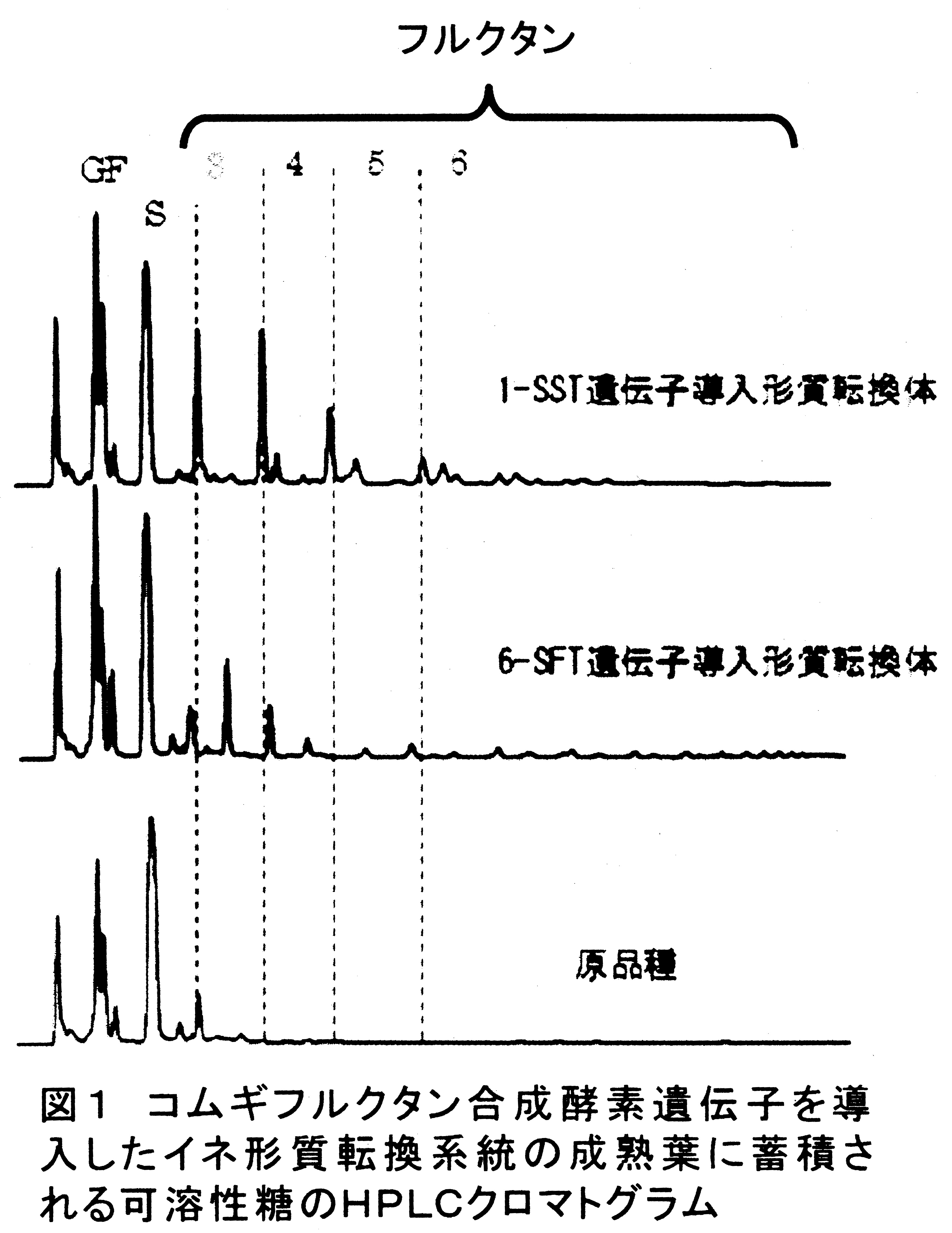 6-fructosyltransferase)の遺伝子を導入した形質転換系統では、原品種には存在しない、β(2,1)結合のイヌリン型フルクタンとβ(2,6)結合主体のレバン型フルクタンがそれぞれに蓄積する(図1)。