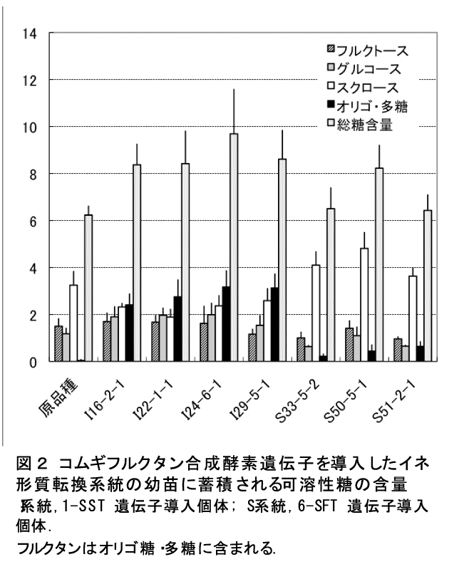 26℃/19℃(16時間日長)の人工気象室で10日間育てたイネ形質転換系統の幼苗では、原品種ではオリゴ糖が殆どないのに対し、フルクタンが蓄積し、その含量は1-SST遺伝子導入系統の方が高い。また、フルクタン蓄積が顕著な個体では、可溶性総糖含量も増加する(図2)。