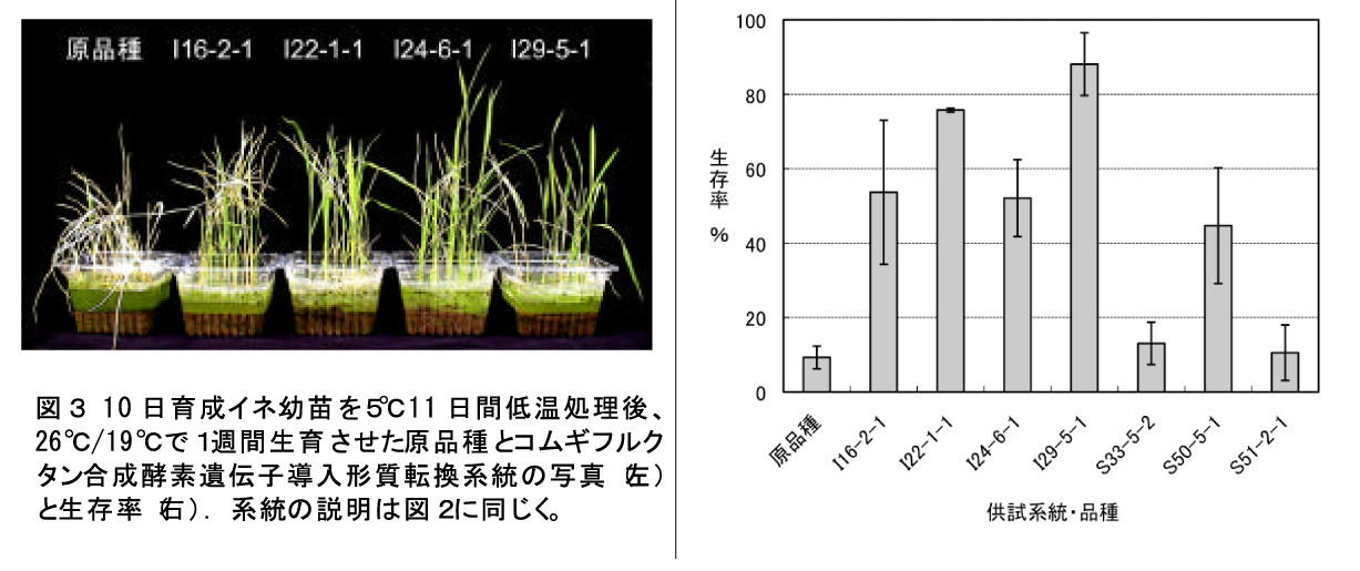 コムギのフルクタン合成酵素遺伝子を導入したイネ形質転換系統では、本来イネでは合成されないフルクタンが蓄積する。フルクタン蓄積イネ形質転換系統の幼苗の耐冷性は、フルクタン蓄積量が多い1-SST遺伝子導入系統で高い。