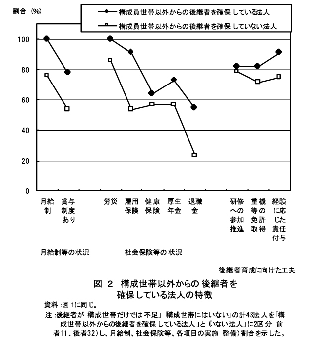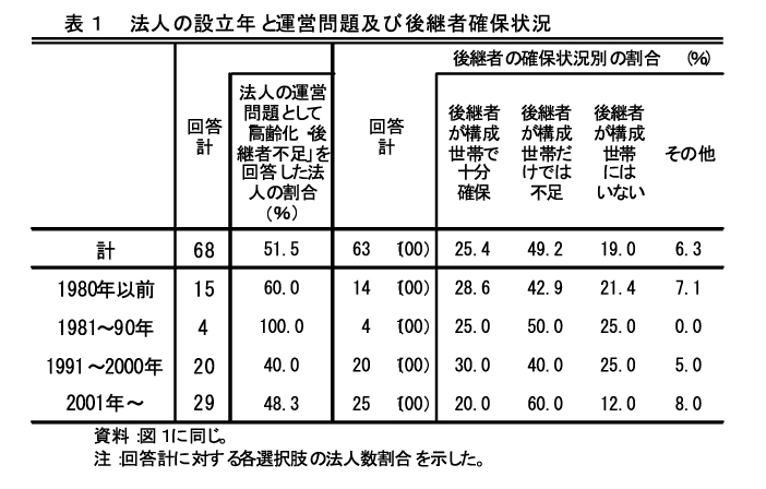 が、2001年以降に設立された法人でも半数近い(表1、48%)。この要因は、2001年以降の設立法人でも後継者が「構成世帯だけでは不足」の法人が多く(60%)、後継者が「構成世帯にはいない」法人(12%)と合計すると72%と、後継者不足の解決が迫られている法人が多数に上るためである。 -