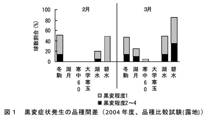 黒変症状発生履歴がある圃場での「冬駒」栽培では土壌pH矯正と硫酸カルシウム施肥が、著しい発生履歴がある圃場では「大学寒玉」の導入が有効である。雪中貯蔵により、収穫時の外観・内部品質ともに長期間維持される。