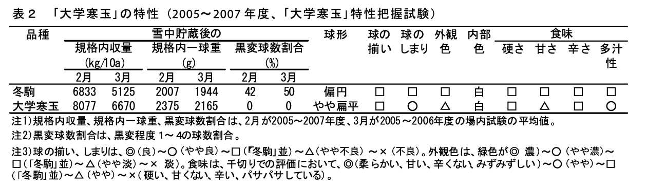 「大学寒玉」は「冬駒」対比で、雪中貯蔵後の規格内一球重が大きく、収量が同等〜多い。また、球形がやや扁平で、外観色がやや淡い。食味官能調査では、「冬駒」に比べて甘みがやや少なく、ややみずみずしいという評価である(表2)。