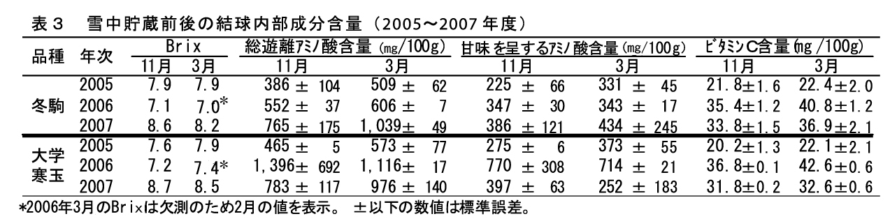 雪中貯蔵を冷蔵庫貯蔵と比較すると、内部成分は大差なく、外葉の腐敗・黄化がごく少なく、貯蔵後の調整歩留まりが高い。また、雪中貯蔵前後では、遊離アミノ酸含量には一定の傾向は認められないが、BrixおよびビタミンCはほぼ同等に維持される(表3)。雪中貯蔵は、地域の自然冷熱を利用して収穫時の外部・内部品質を長期にわたり維持できる優れた低コスト貯蔵法である。