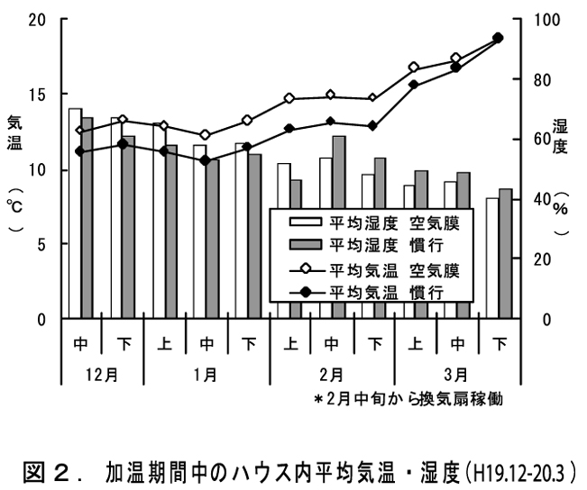 加温期間の12〜3月の空気膜ハウス内の平均気温は1.5〜2.0℃前後高くなり、最低、 最高気温も空気膜ハウスの方が高い。湿度は同等である(図2)。