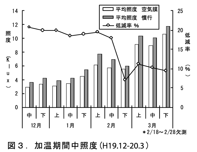 空気膜ハウス内平均照度は慣行ハウスに比べ12〜2月中旬まで20%、2月下旬〜10 月までは10〜15%低下する(図3)。