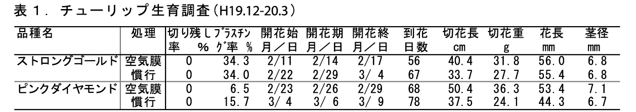 - 空気膜ハウスのチューリップは生育、開花が早く、切り花品質が優れる(表1)。