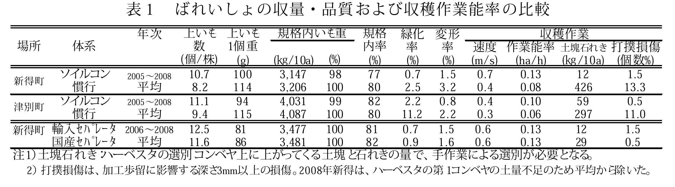 ソイルコン体系では、土塊と石れきが少なく膨軟な培土が形成され、緑化率と変形率は、慣行に比べ少なく、収穫時の打撲の発生も少ない(表1)。