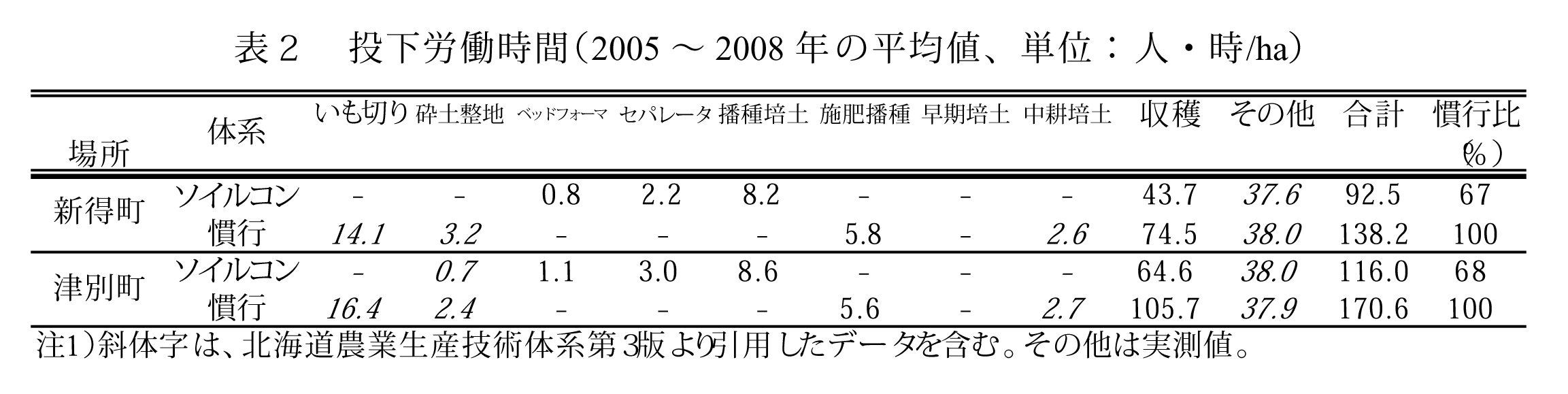 栽培期間全体の投下労働時間は、ソイルコン体系では全粒種いも使用によるいも切り作業の省略と収穫作業能率の向上により、慣行体系の70%以下に低下する(表2)