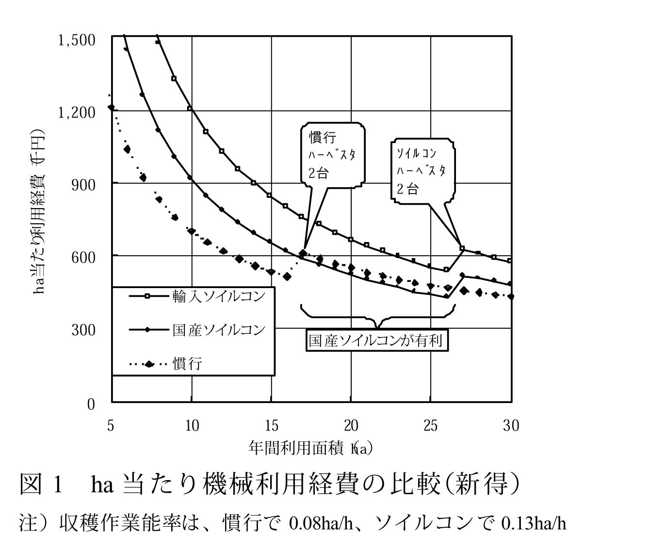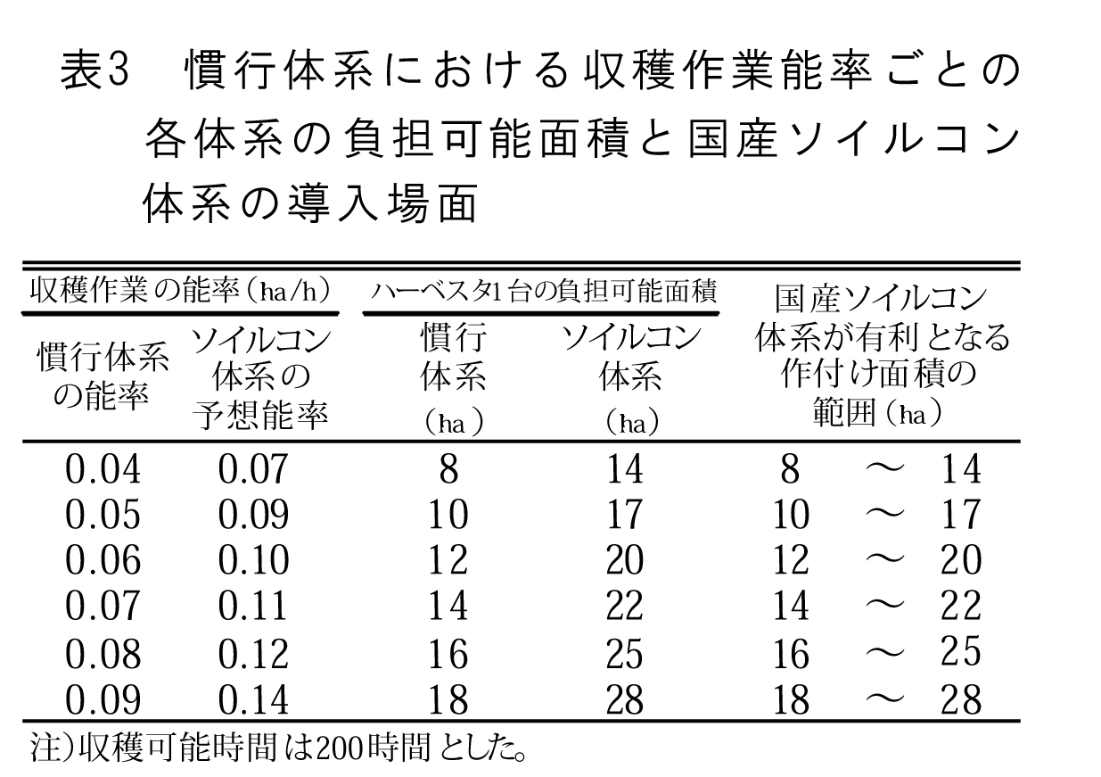 慣行体系の作業能率ごとに予想されるソイルコン体系の作業能率を求め、収穫作業可能時間を200時間としたときの負担可能面積を求めると、両者の間が低価格な国産セパレータを使う国産ソイルコン体系が導入可能な場面と考えられた(表3)。