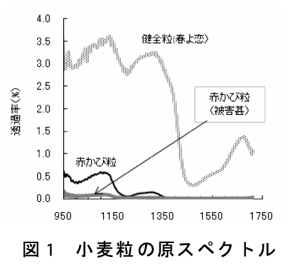 小麦粒の近赤外線透過特性を解析した結果、近赤外域全般において健全粒よりも赤かび粒の透過率が小さい特徴があることから(図1)、近赤外線センサを搭載する光学式選別機が赤かび粒率の除去に適している。