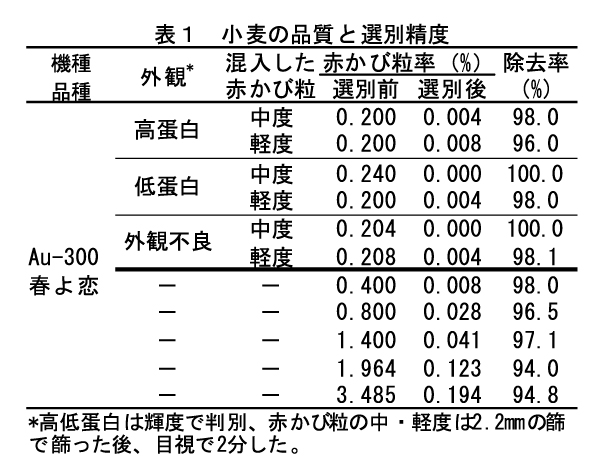 近赤外線センサを搭載するベルト式小麦光学式選別機(Au-300)で歩留95%以上で感度設定した場合、原料(春よ恋)の赤かび粒率が1.4%以下であれば、赤かび粒の被害程度、外観に関わらず検査基準の0.049%を下回ることができる(表1)。比重選別機までの工程で赤かび粒を1.4%以下にし、他の形質を基準値以内に調製しておけば光学式選別機を使って赤かび粒率の基準を満たすことができる。