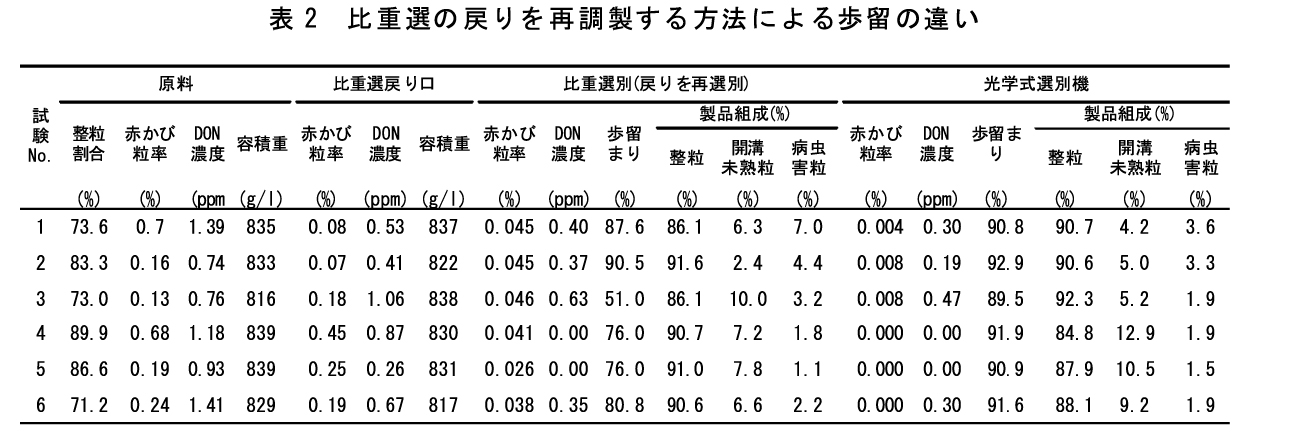比重選別機の戻りを光学式選別機にかけることで、赤かび被害粒を効率的に除去し、現行の比重選別機の調製法より製品歩留を向上できる。