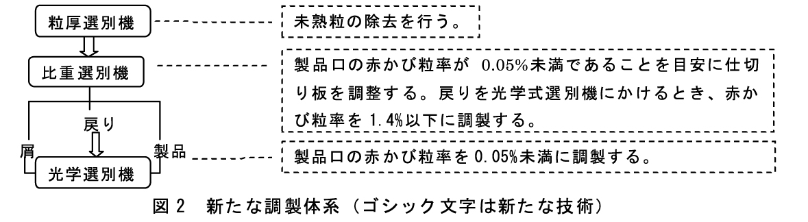 光学式選別機では開溝未熟粒率の除去は困難であるため、このような充実不足粒が多い原料では比重選別機での赤かび粒の除去を勘案しながら、歩留を調製する必要がある。